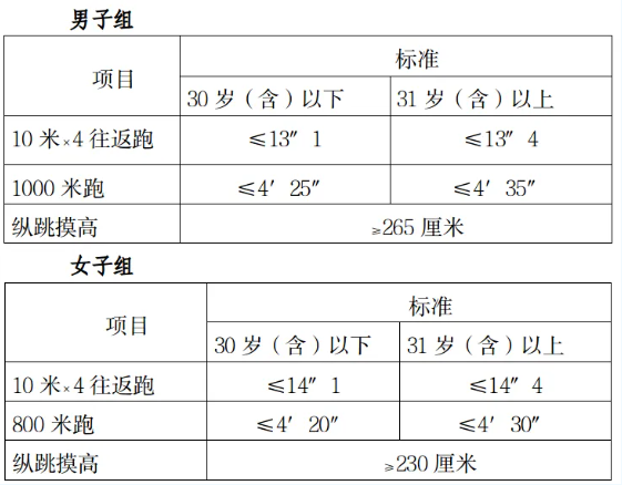 2.體測項目和標準。參照《關于印發(fā)公安機關錄用人民警察體能測評項目和標準(暫行)的通知》(人社部發(fā)〔2011〕48號)的項目及測試規(guī)則,結(jié)合《公安民警體育鍛煉達標手冊》成績標準,本次體能測評的項目和標準如下: