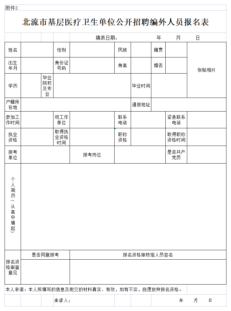2.《北流市基層醫(yī)療衛(wèi)生單位公開招聘編外人員報名表》(附件3);