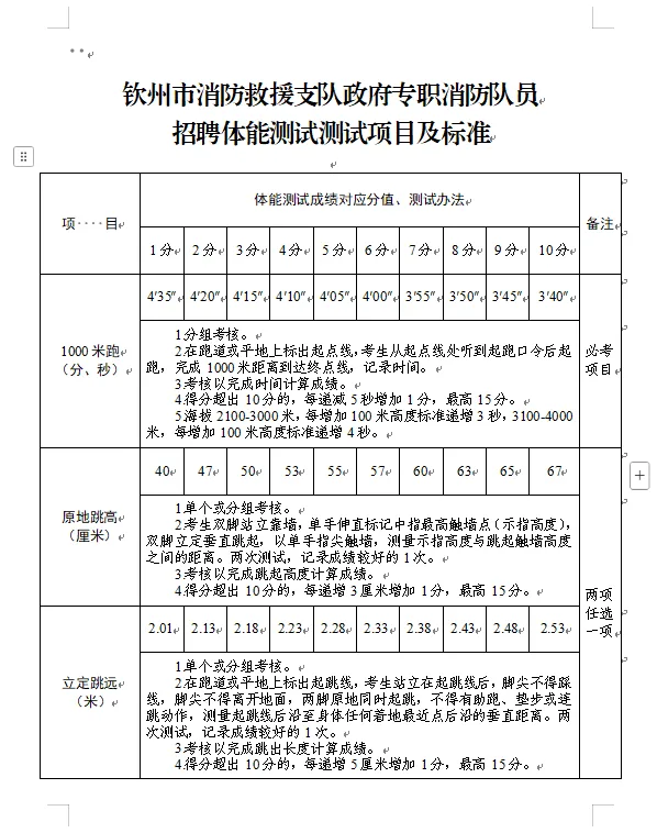 2.體能測(cè)試:(1)必考項(xiàng)目:1000米跑;(2)選考項(xiàng)目:①立定跳遠(yuǎn)、原地跳高二選一;②單杠引體向上、俯臥撐二選一;③10米×4往返跑、100米跑二選一;(3)注意事項(xiàng):應(yīng)聘人員須參加體能測(cè)試,并當(dāng)場(chǎng)簽訂《體能測(cè)試健康安全風(fēng)險(xiǎn)承諾書》,體能測(cè)試有兩項(xiàng)及兩項(xiàng)以上不得分的視為不合格(標(biāo)準(zhǔn)參照附件)。未按時(shí)參加或因身體原因無(wú)法測(cè)試者,視為自動(dòng)放棄。(體能測(cè)試測(cè)試項(xiàng)目及標(biāo)準(zhǔn)附后)