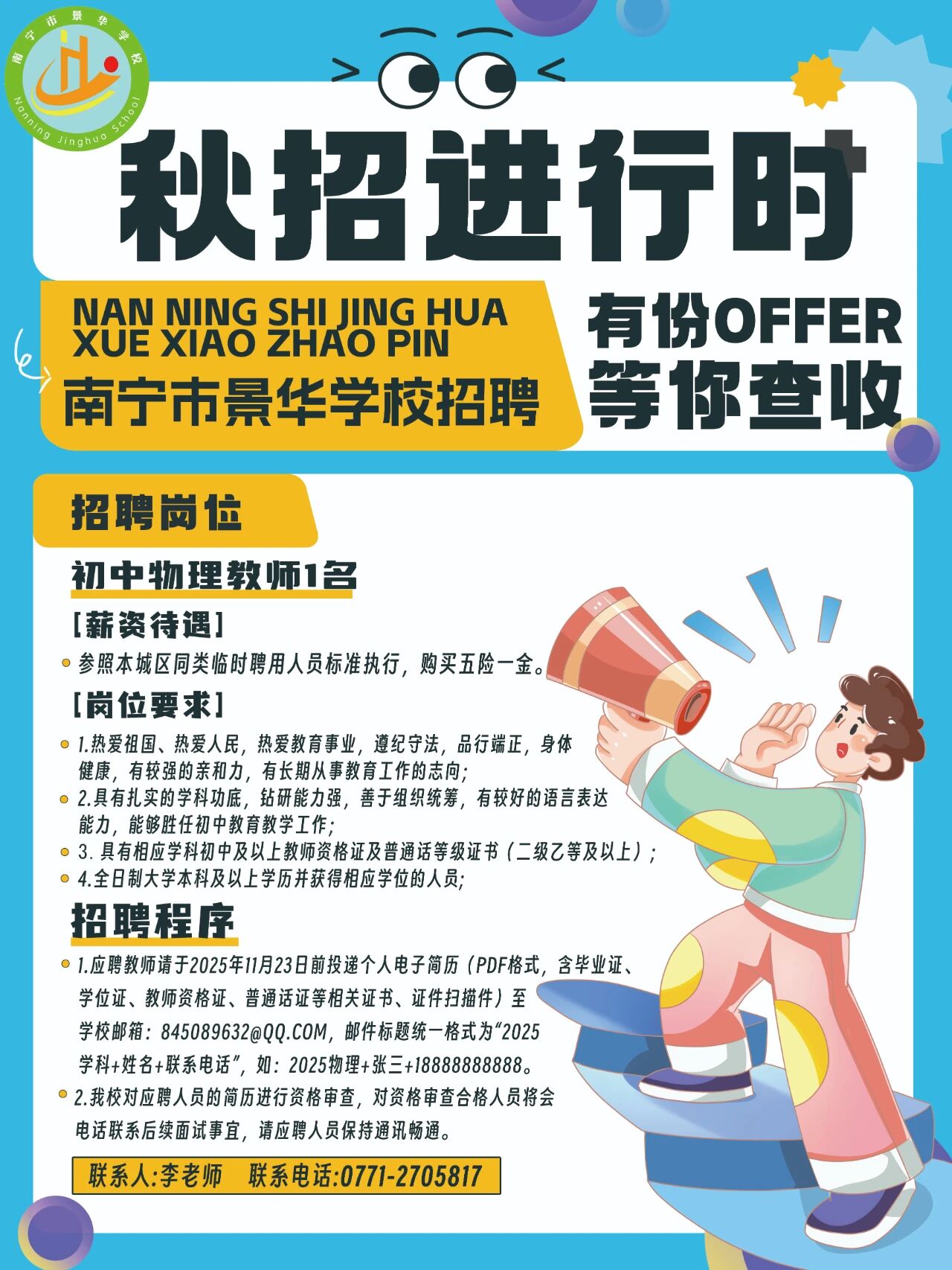原文標題:南寧市景華學校招聘初中物理教師1名